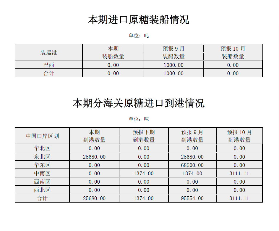 原糖(關稅配額外(wài)): 本期進口實際裝船(chuán)0.00噸,本月(yuè)進口預報(bào)裝船(chuán)1000.00噸,下(xià)月(yuè)進口預報(bào)裝船↓(chuán)0.00噸。