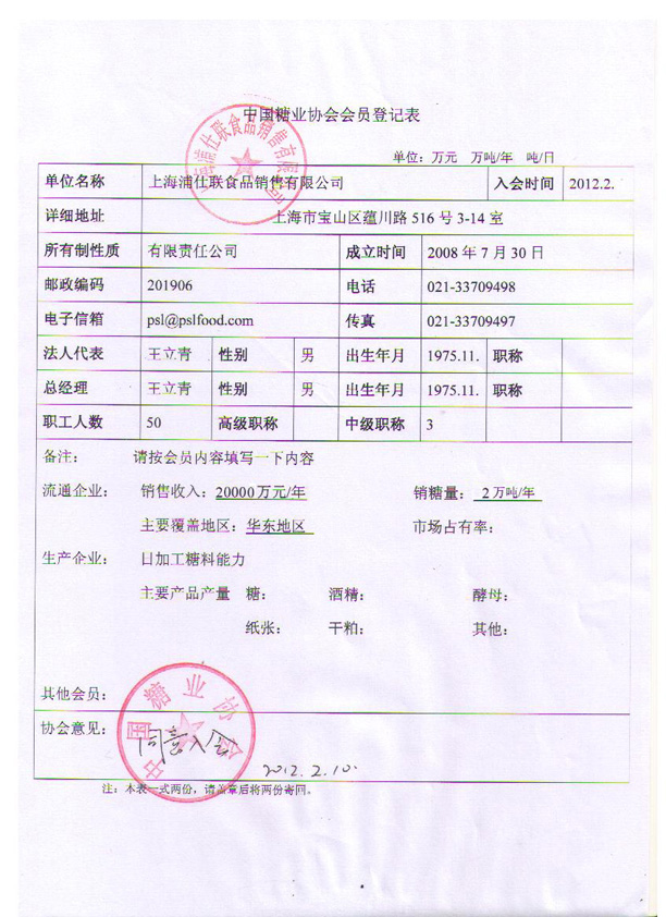 2012年(nián)2月(yuè),經中國(guó)糖業(yè)協會(huì)常務理(lǐ)事(shì)會(huì)批準,上(shàng)海(hǎi)浦仕聯食品銷售有(yǒu)限公司↑正式加入中國(guó)糖業(yè)協會(huì)。