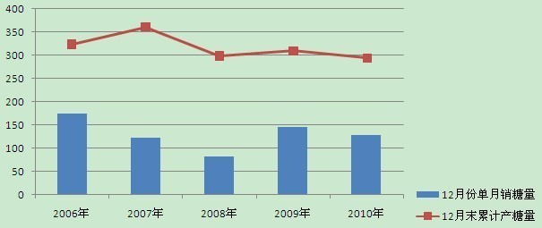 第一(yī),産量下(xià)降導緻新糖上(shàng)市(shì)量減少(shǎo)。上(shàng)圖'為(wèi)過去(qù)5個(gè)榨季的(de)12月(yuè)份累計(jì)産量與單月(yuè)銷量,通(tōng)過此圖不(<bù)難發現(xiàn),2010年(nián)12月(yuè)産量和(hé)銷量呈現(xiàn)出下(•xià)降趨勢,據了(le)解在去(qù)年(nián)12月(yuè)份時(shí),北(běi)方甜菜糖多(duō)産多(duō)銷,但(dàn)無奈生(shē↑ng)産企業(yè)開(kāi)始停機(jī)收榨,生(shēng)産高(gāo)峰已過,而南(nán)方甘蔗糖産區(qū✔)的(de)生(shēng)産雖然“漸入佳境”,但(dàn)天公不(bù)作(zuò)美(měi),廣西(xī)主産區(≈qū)出現(xiàn)大(dà)範圍降雨(yǔ)和(hé)霜凍天氣,砍收不(bù)力,入榨甘蔗質量不(bù)佳等因素,甘蔗糖産量随之下(x₽ià)滑。以上(shàng)因素都(dōu)在一(yī)定程度上(shàng)限制(zhì)了(le)可(kě)供給食糖的(de)數(shù)量,進而影(yǐn÷g)響了(le)新糖的(de)消費(fèi)。