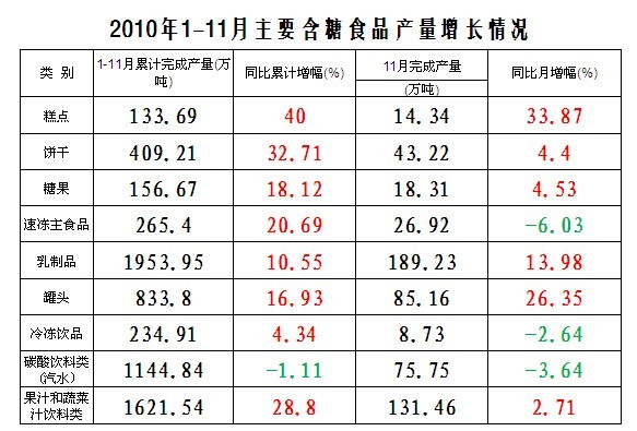 表格內(nèi)容為(wèi)我國(guó)2010年(nián)最新公布的(de)主要(yào)含糖食品産量增長(c¥háng)情況。通(tōng)過對(duì)比不(bù)難發現(xiàn),1-11月(yuè)份的(de)整體(tǐ)産量除$碳酸飲料出現(xiàn)不(bù)到(dào)1.2%的(de)小(xiǎo)幅下(xià)降外(wài),其餘種類的(∞de)産量均有(yǒu)較大(dà)幅度的(de)增長(cháng)。(通(tōng)過我國(guó)2009/10榨季食糖産不(bù)足需的(de)供需平衡,食糖現(xiàn)貨庫存處于←曆史偏低(dī)水(shuǐ)平也(yě)在業(yè)內(nèi)基本達成共識,這(zhè)也(yě)是(shì)本文(wén)沒有(yǒu)将庫存考慮到(dào)λ可(kě)供流通(tōng)食糖總量的(de)一(yī)部分(fēn)原因。)而11月(yuè)單月(yuè)數(shù)據顯示大(dà)部分(fēn)含糖食品産量也(yě)呈現(xiàn)π增長(cháng),那(nà)麽在12月(yuè)中,含糖食品總量會(huì)以何種姿态展現(xiàn)在我們面前?這(zhè)可(kě)能(néng)要(yào)等到(dào)本月(yuè$)下(xià)旬才能(néng)得(de)知(zhī)。