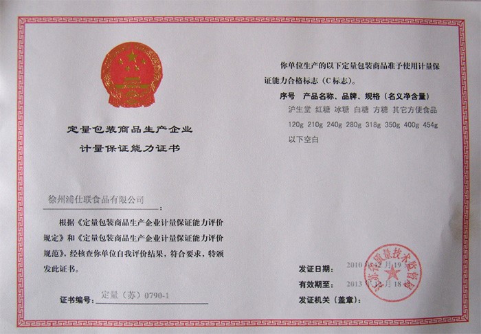 近(jìn)日(rì),江蘇省質量技(jì)術(shù)監督主管部門(mén)正式為(wèi)徐州浦ε仕聯食品有(yǒu)限公司頒發《定量包裝商品生(shēng)産企業(yè)計(jì)量保證能(néng)力證書(sh≈ū)》(簡稱計(jì)量C認證)。